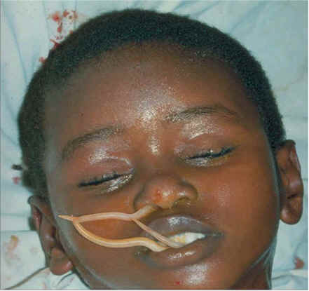Massive ascaris infection in child shown at right. A large bolus of worms was expelled following antihelminthic treatment. This is one of the best-known photographs showing severe roundworm infection.