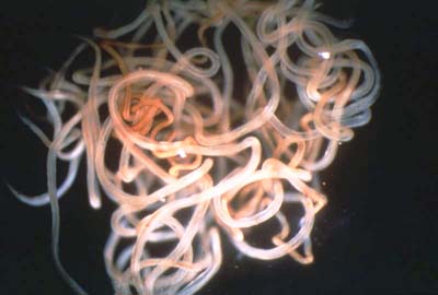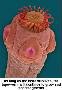 There are numerous species of tapeworm, which may be as long as 50 ft. (15 m). Their bodies are made up of segments called proglottids, which contain male and female sexual organs and which house their eggs. The Taenia genus of tapeworm includes T. solium, the pork tapeworm, which has been known to crawl out of the anus of an infected human. Another worm often found in under-cooked pork is Trichinella spiralis, which brings about the condition known as trichinosis. The latter disease is rarely fatal, but it can cause extreme discomfort, characterized by sore, tender muscles. Thanks to enhanced efforts at meat inspection, the incidence of trichinosis in U.S. pigs has dropped to less than 1%. Nonetheless, it is still quite possible to ingest the parasite from eating undercooked game, particularly bear. |