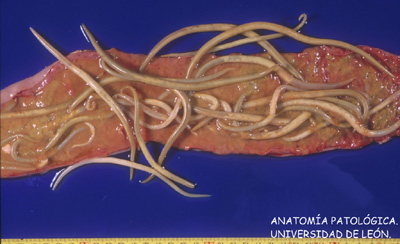 Severe ascaris infection with worms exiting through mouth and nose. Anesthesia appears to agitate the worms and when there is infection of adults in the lungs they can exit the mouth and nose. The normal life cycle of ascaris is to migrate to the lungs for the larval stage and grow to an adult in the intestines, but sometimes the adults reside in the lungs.