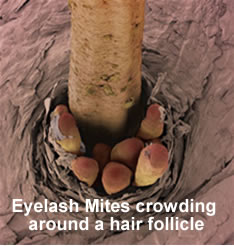 Demodex folliculorum, or the demodicid also known as the eyelash mite, is a tiny mite, less than 0.4 mm long, that lives in pores and hair follicles, usually on the nose, forehead, cheek, and chin, and often in the roots of eyelashes. (A follicle is the pore from which a hair grows). It is not really a parasite since it lives on dead skin cells and secretions, but overgrowth of them can cause irritation.