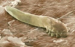 Demodicids have a wormlike appearance, with legs that are mere stumps. People with oily skin, or those who use cosmetics heavily and don't wash thoroughly, have the heaviest infestations ... but most adults carry a few demodicids. Inflammation and infection often result when large numbers of these mites congregate in a single follicle.