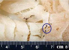 Parasites are organisms that live on or within another organism, called the “host.” Most fish species are susceptible to worm infestations but a few species, particularly those in sharks and fishes in the grouper, amberjack, and drum families, appear to be more susceptible to them. Larger, older fish can acquire many parasites over the course of their lives. Though they appear to be very intrusive, parasites rarely cause health complications for the fish. Although most commonly seen by anglers in the muscle, parasitic worms can live in every organ. For example the ovary of this grouper is inhabited by large, red nematodes or “roundworms.” In general, parasite density and diversity can be good indicators of the overall health of a marine environment. Fish possessing a high diversity of species of parasites in relatively low abundances are commonly found in healthy marine systems. Also see the article Fish and Parasites |