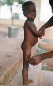 Guinea Worms. First swallowed by a "Cyclops" or water flea, the Guinea worm transforms into a third stage larvae. The Cyclops, ingested by a human being, are consumed by the stomach's juices and the larvae of the Guinea Worm are released. They remain in the stomach for up to three months. After mating, the male dies and the female bores through the body making her way to the extremities, usually the lower leg or foot, but she can go to any part of the body. Once settled, just under the skin, she begins to grow, by eating the flesh of her carrier, into a three to As the worm matures, a painful blister appears on the skin of the carrier. When the person puts the affected part of the body in water, the blister breaks and hundreds of thousands of tiny first stage larvae are released into the water. The adult female worm then comes slowly out of the body of its carrier through the sore made by the broken blister. It usually takes several weeks for the worm to completely exit the body. People, having no choice, drink the infested water, ingest the worm and the entire cycle begins once again. No matter how often people are infected they do not become immune to the Guinea Worm. Both young and old alike are subject to this dreaded parasite. |