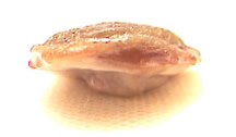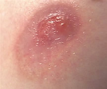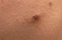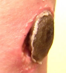 An eschar forms within 24 hours after application of Cansema. Here it is a few days later when it is halfway ejected. At this stage it is important NOT to pick at it. It should be ejected on its own by the skin forming underneath!