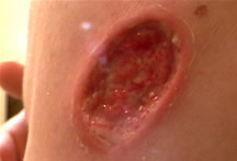 Further Warnings and discussion on use of esherotic salves. Alpha Omega Labs has had to move to various countries to avoid prosecution. See the pictures below of a mole-sized cancerous lesion on the skin. As the text says, it is the tip of the iceberg. The eschar (scab) that is formed is many times larger than one would expect. One can be assured that the eschar was composed of only cancerous cells.